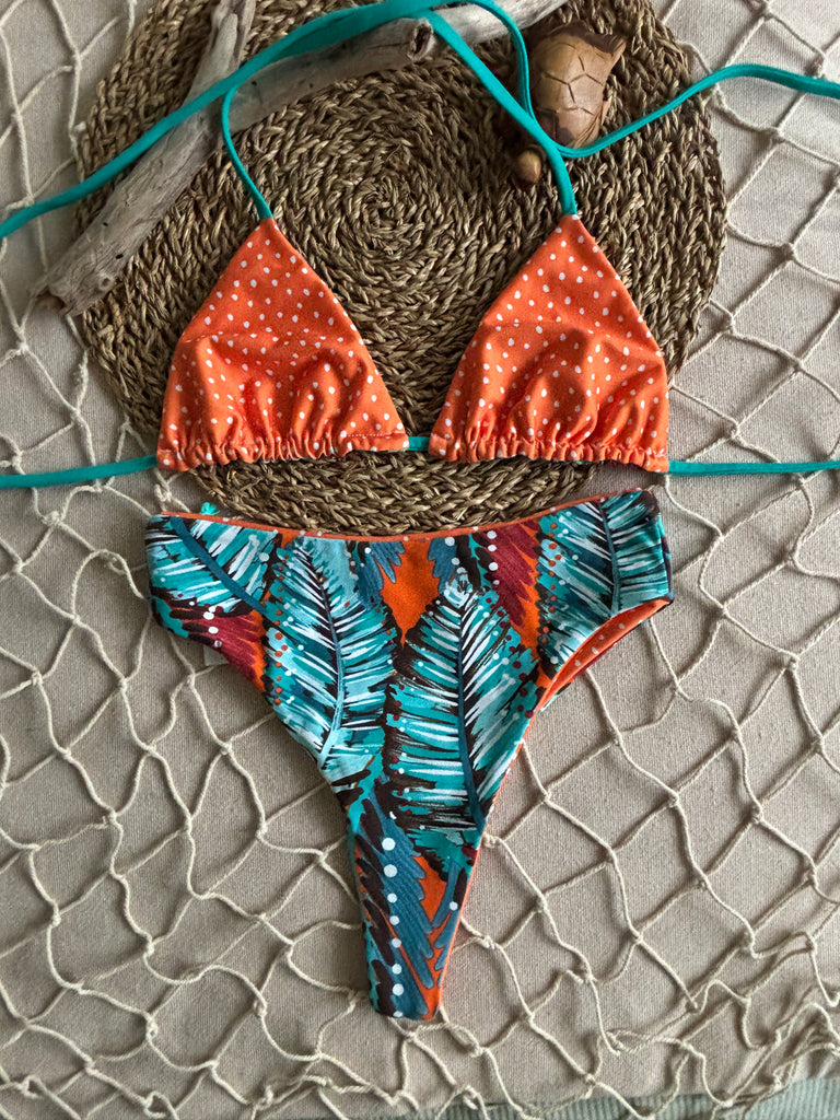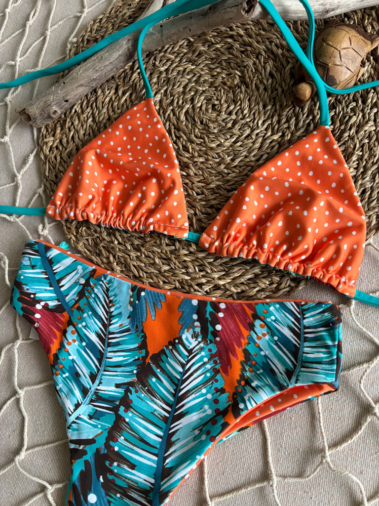 Classic triangle top. Reinforced straps with elastic and adjustable at neck and bust. Reversible.