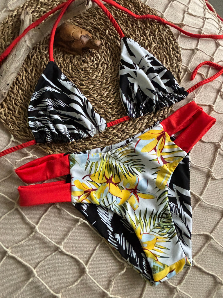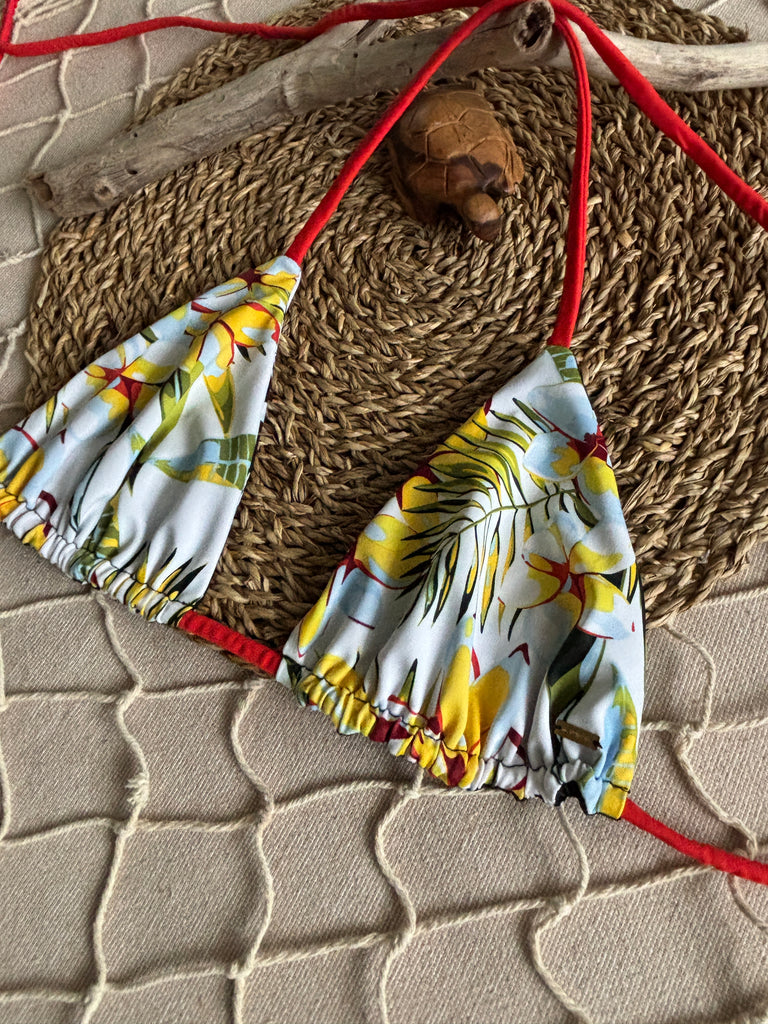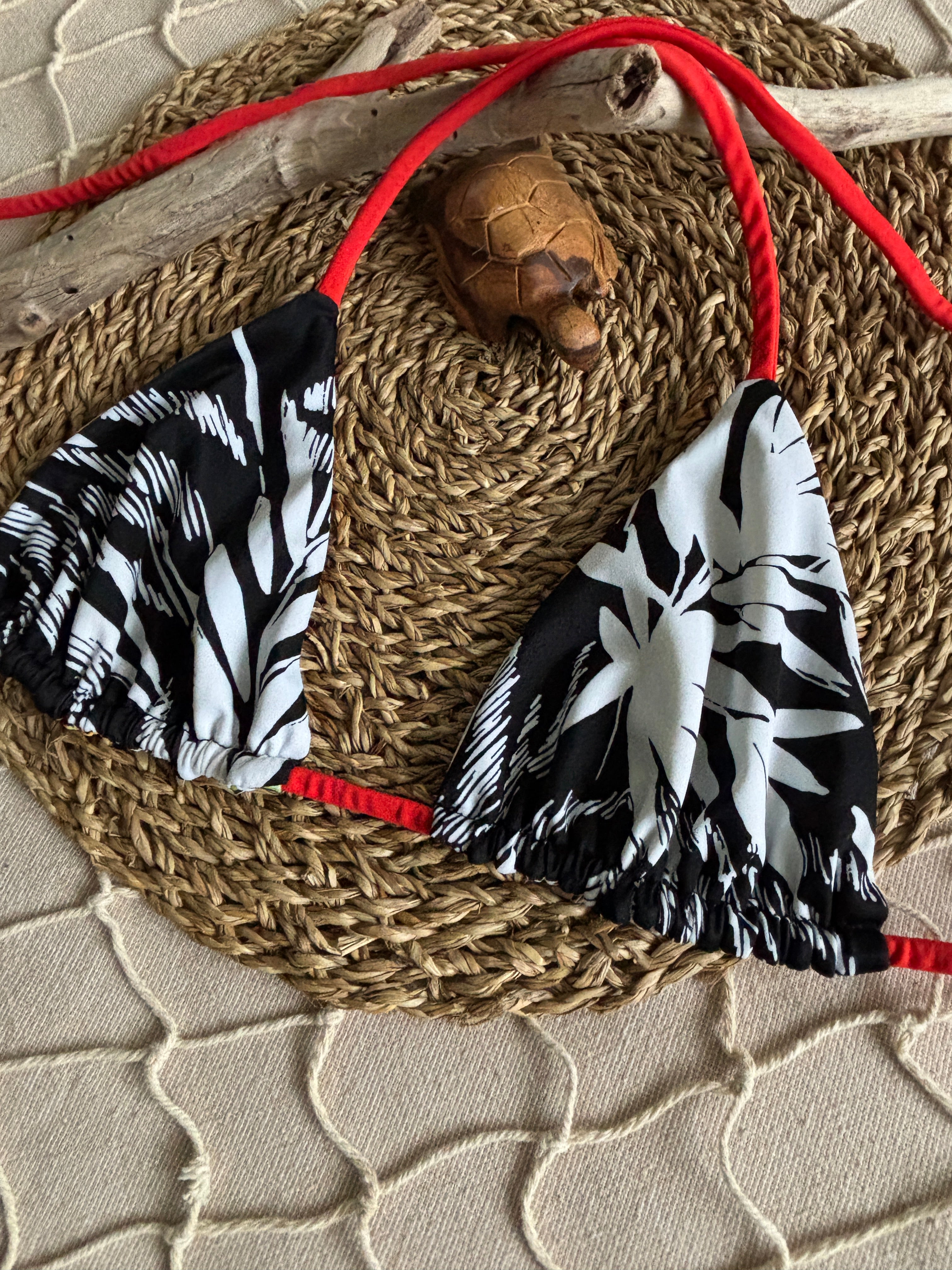 Classic triangle top. Reinforced straps with elastic and adjustable at neck and bust. Reversible.